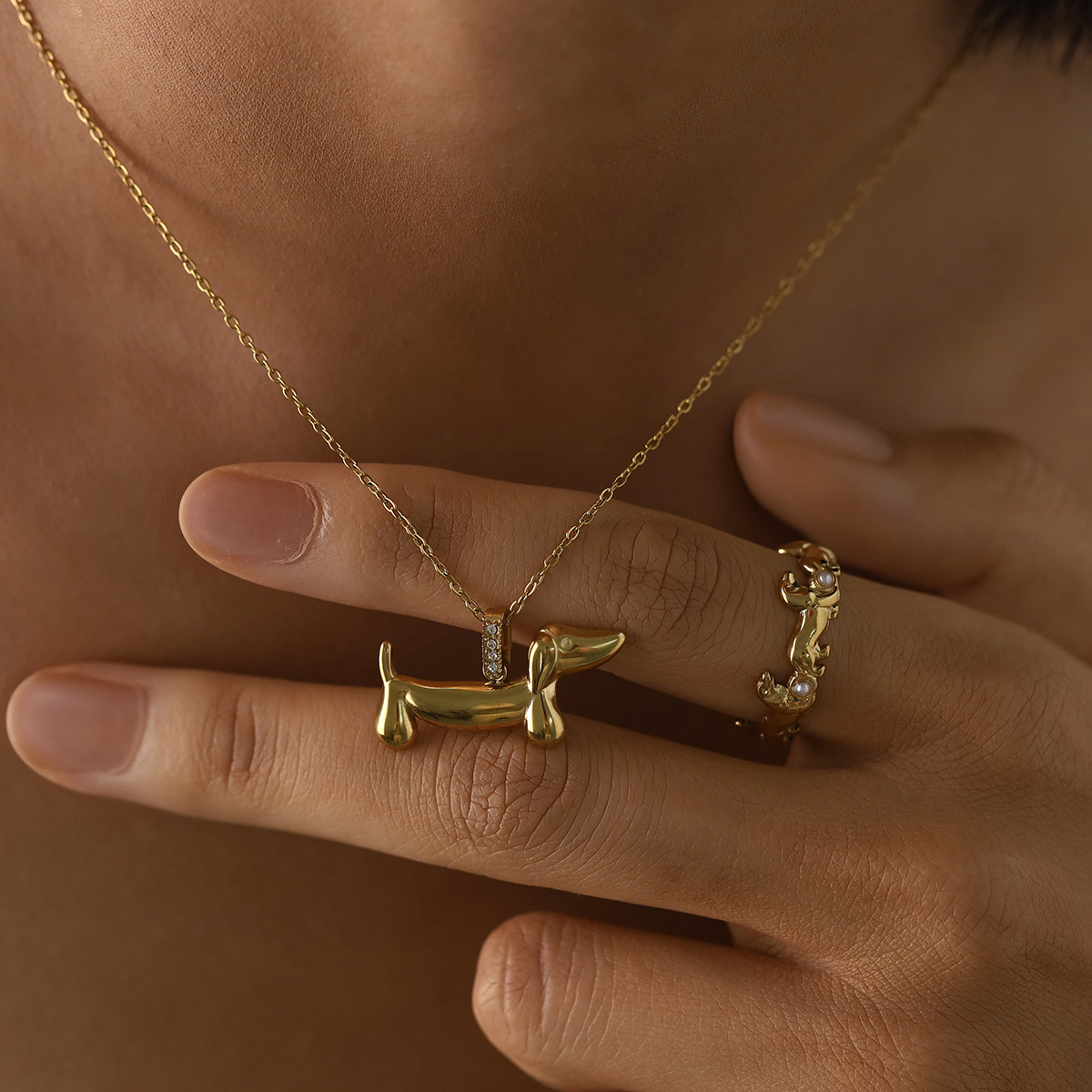 Small Animal Series Dachshund Pendant Clavicle Chain Earrings Ring Three-Piece Set Cross-Border Popular Titanium Steel Necklace Earrings