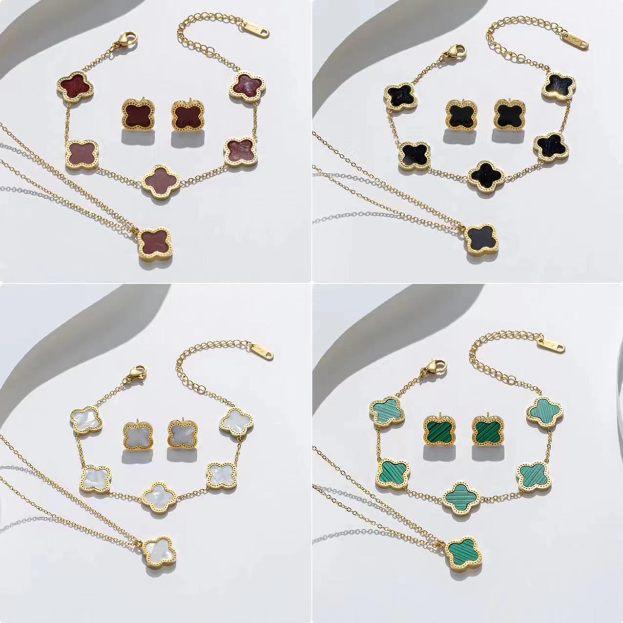 European and American Fashion Stainless Steel Lucky Five-Leaf Clover Petal Earrings, Bracelet, Necklace Set for Women, Classic Light Luxury Style