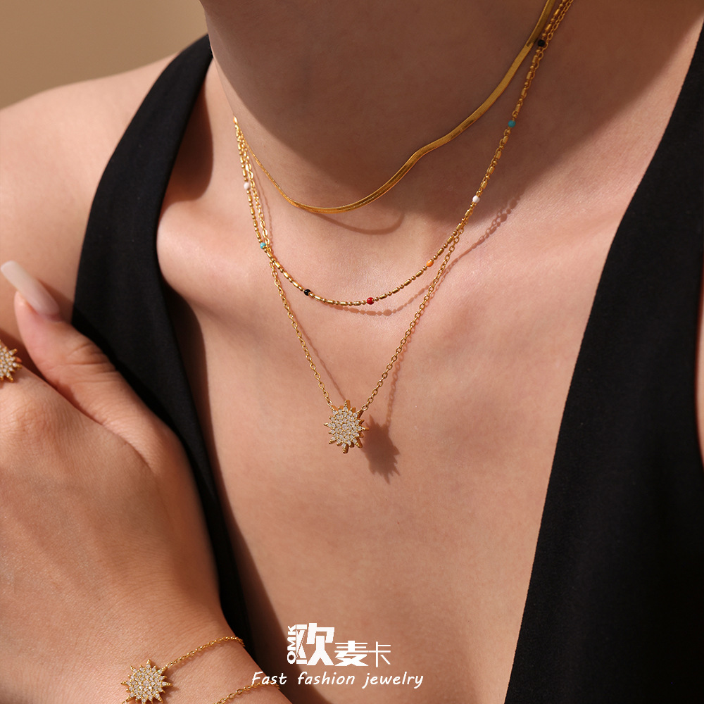 Omaca 5A Zircon Full Diamond Sunburst Necklace Bracelet Ring Niche Accessible Luxury Stainless Steel Jewelry Set