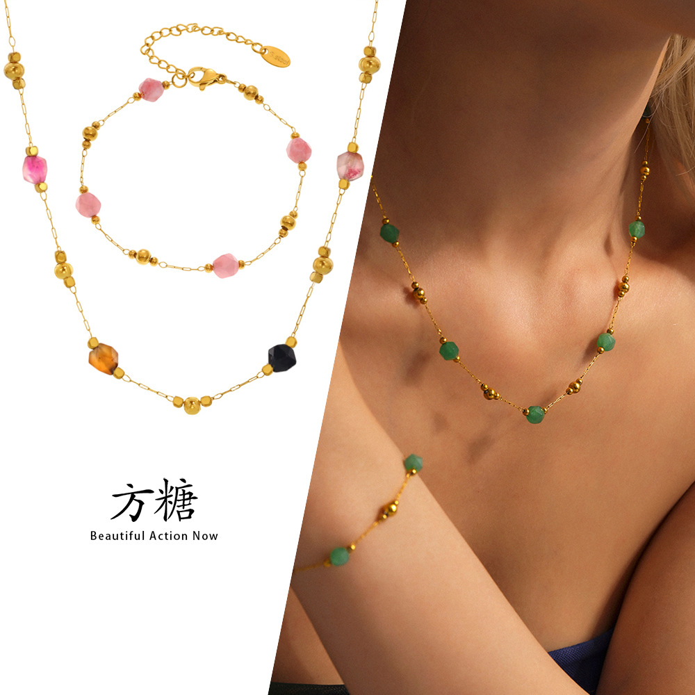 Sugar New Style Simple Multicolor Cut Agate Beaded Collarbone Necklace Niche Bracelet Stainless Steel Jewelry suit Women