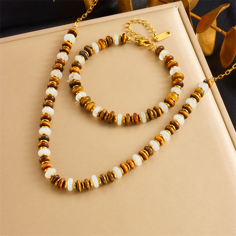 European and American Retro Maillard Tiger Eye Resin Beaded Stainless Steel Chain Necklace Bracelet suit