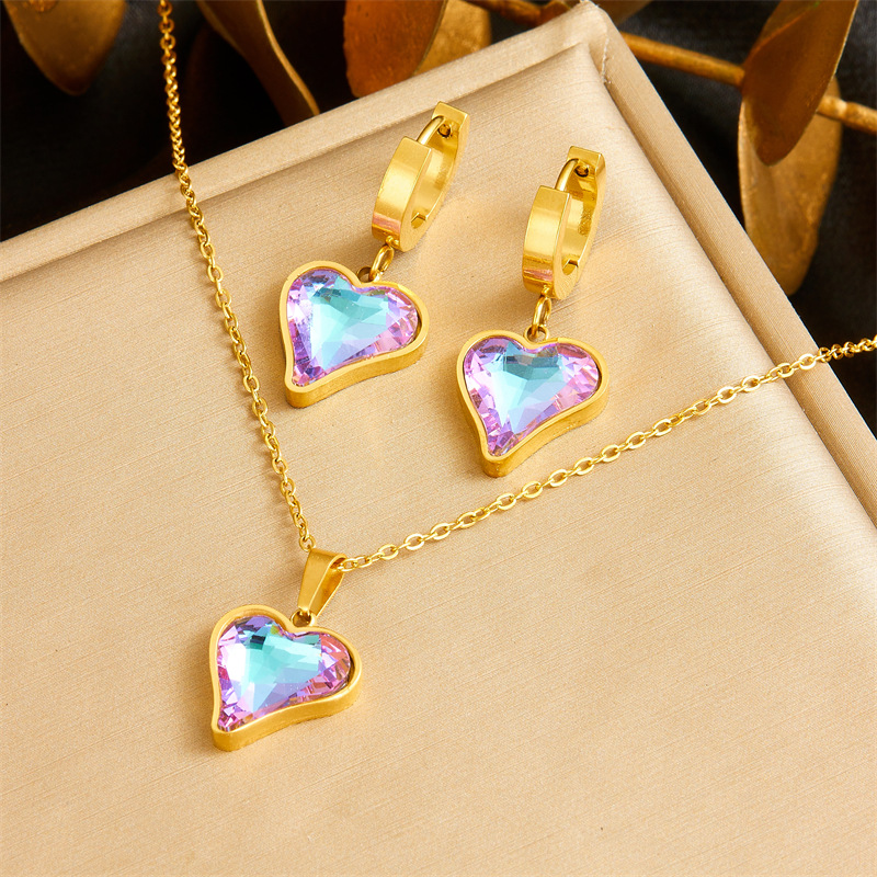 Cross-border fashion new colorful rhinestone love pendant stainless steel chain necklace earrings jewelry women's set
