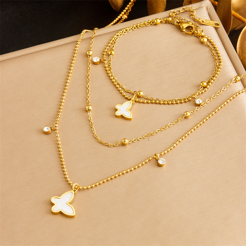 Korean-style Niche Minimalist with Diamond Butterfly Double-layer Gold-plated Stainless Steel Chain Bracelet Necklace Jewelry suit