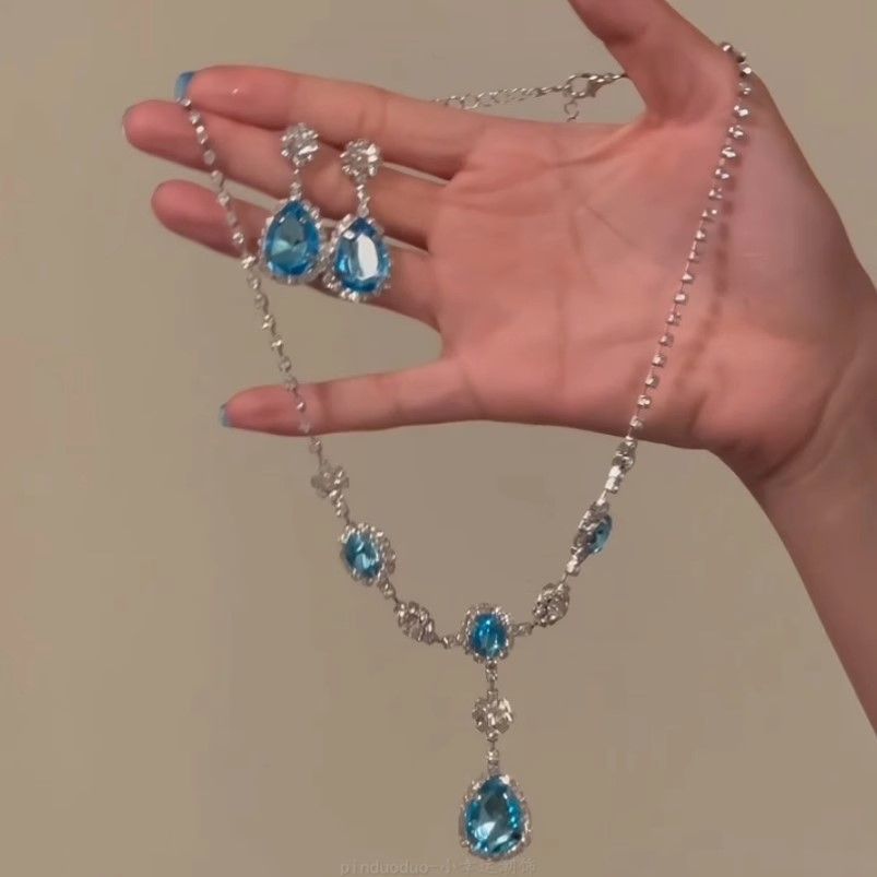 Blue Cool Water Drop Zircon Necklace Earrings Set Women's Accessible Luxury Elegant High-End Clavicle Chain Choker