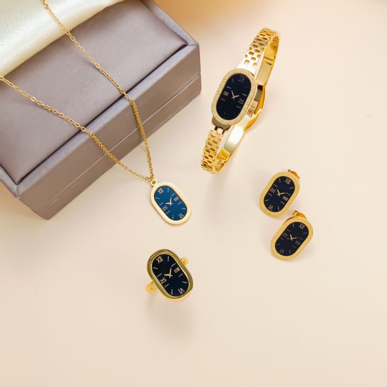 Cross-Border Wholesale Electroplated 18K Gold High-End Women's Non-Fading Jewelry Watch Stainless Steel Titanium Steel Jewelry Set