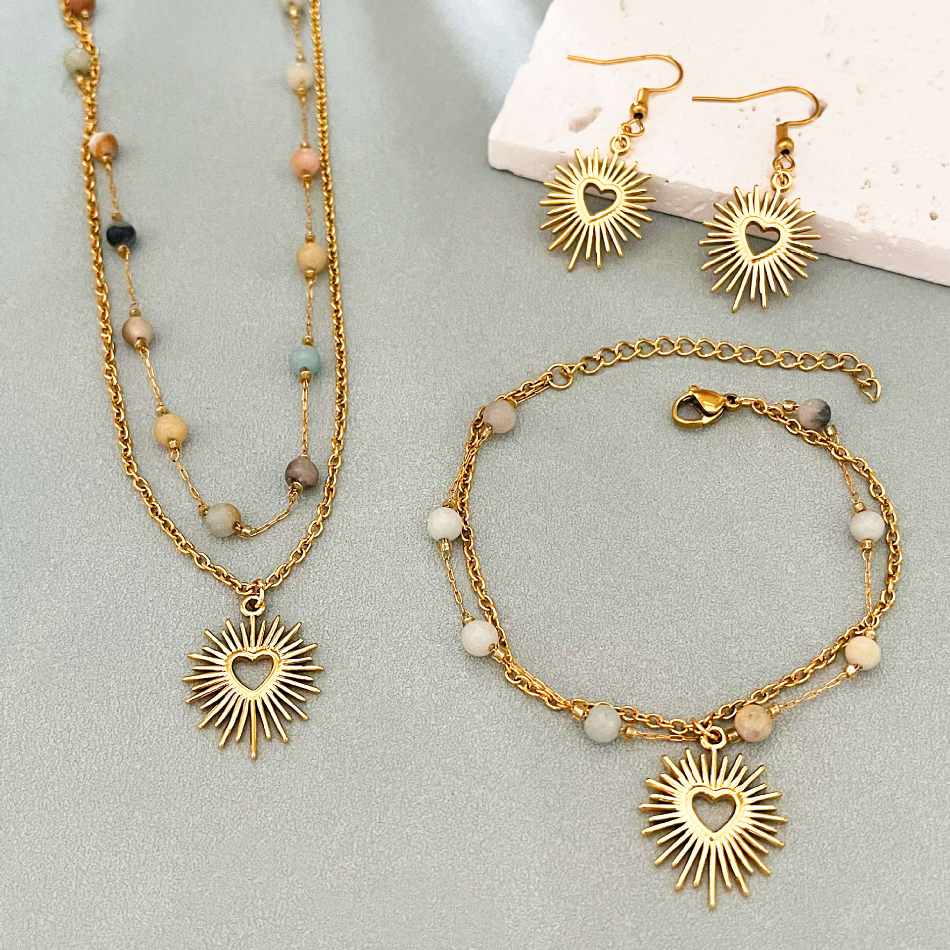 European and American Cross-Border 2025 New Stainless Steel Double-Layer Sunlight Heart Bracelet Necklace 18K Gold Set Accessories for Women