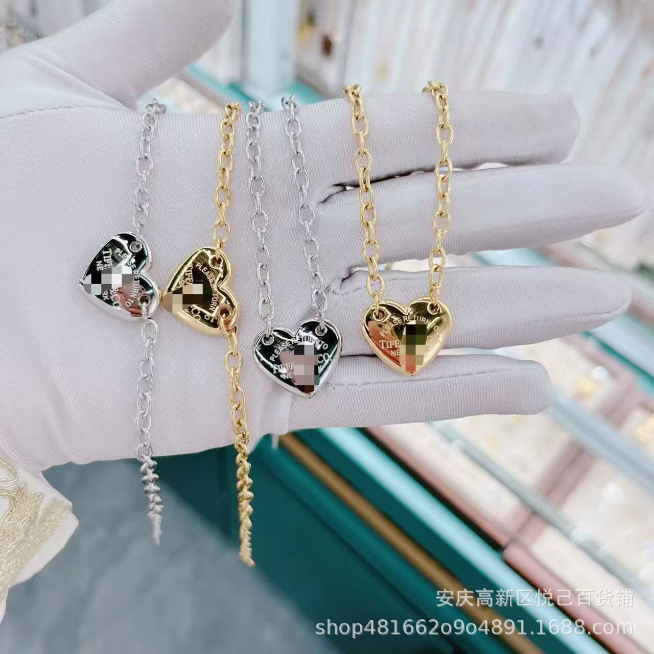 Cross-Border Popular t Letter Set Stainless Steel New Style Micro-Inlaid Heart Necklace and Bracelet Set, Heavy Craftsmanship, Exquisite and Fashionable