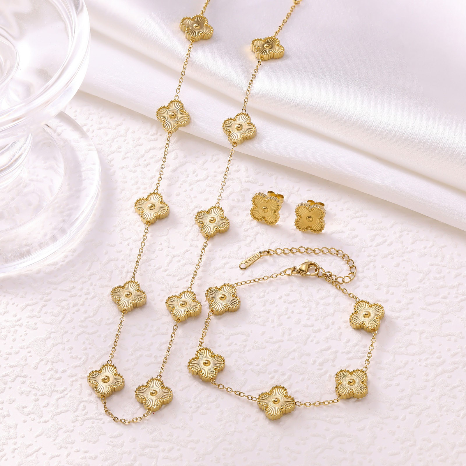 Cross-border European and American fashion stainless steel lucky five-leaf clover petal earrings bracelet necklace suit ladies cross-border new