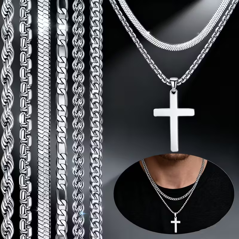 Amazon's Best-Selling Titanium Steel Cross Men's Necklace 7-Piece Set Women's Multi-Layered Cuban Necklace Set Decoration