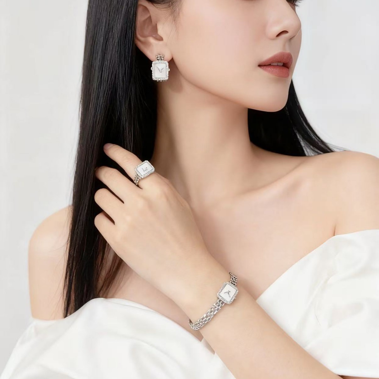 Simple and Fashionable Zircon Square Watch Chain Ring Open Ring Adjustable Simple Hand Jewelry Earrings Set