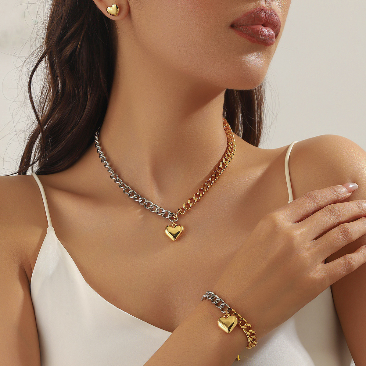 Cross-Border New Stainless Steel Full Diamond Heart Handmade Chain Necklace Bracelet Set Plated with 18K Real Gold Jewelry