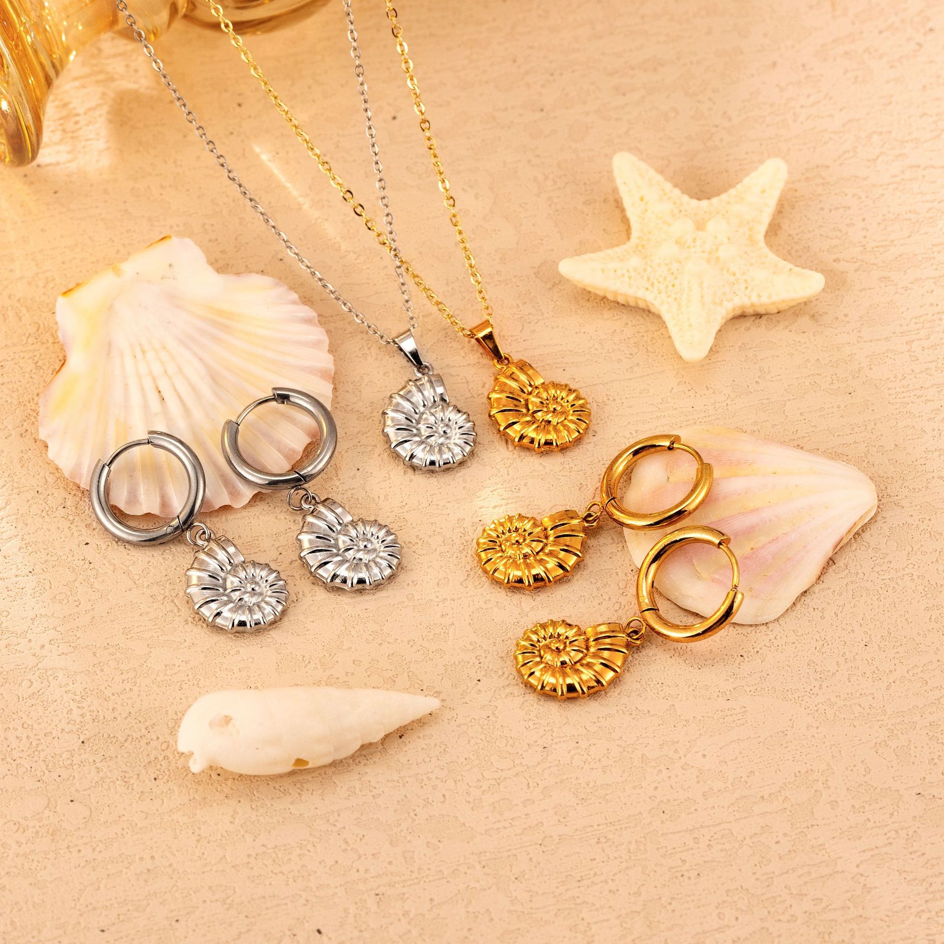 Cross-Border Fashion Stainless Steel Conch Pendant Earrings Set Women's Versatile 18K Marine Style Titanium Steel Earrings Wholesale