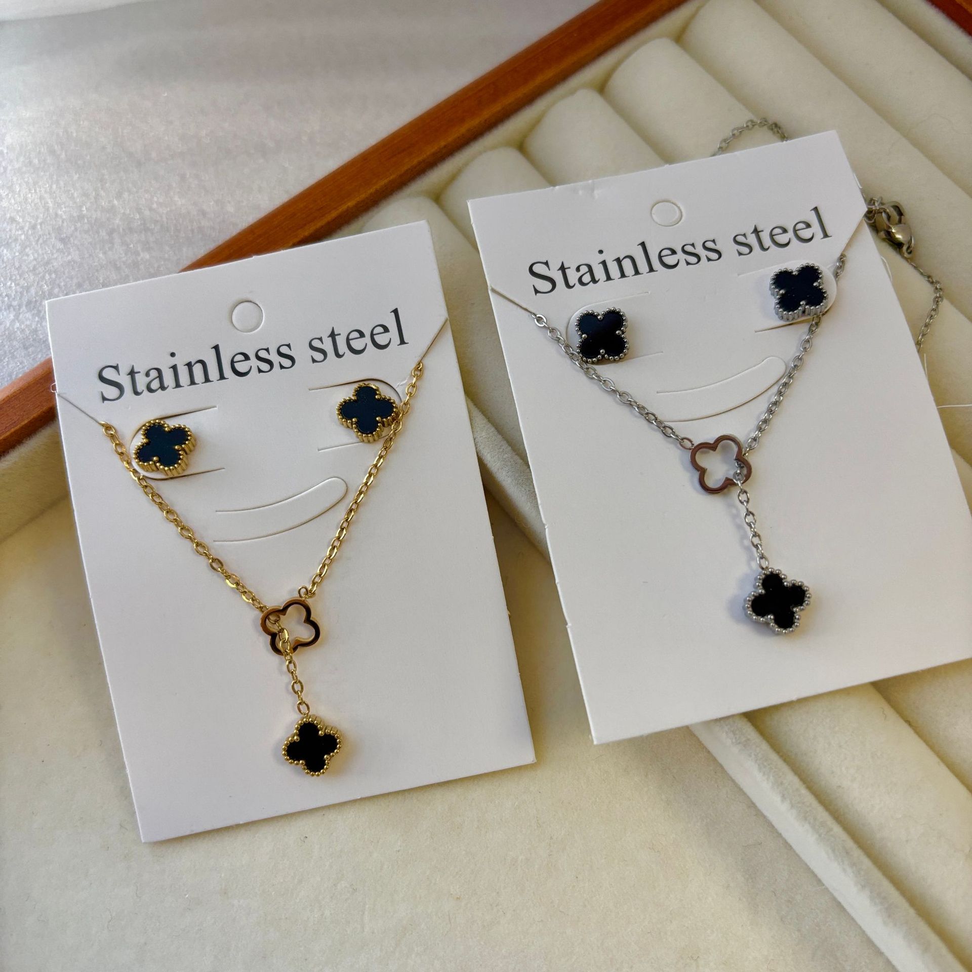 Cross-Border E-Commerce Popular Stainless Steel Lucky Four-Leaf Clover Necklace Earrings Set Decoration Live Broadcast Factory Wholesale Supply