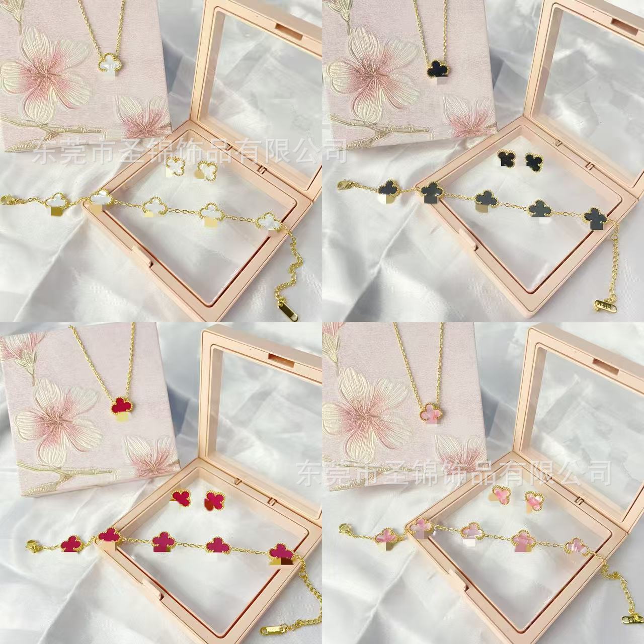 2025 Trending Internet-Famous Xiaohongshu Clover 18K Gold Necklace Mother-Of-Pearl Cross-Border Three-Piece Jewelry Wholesale