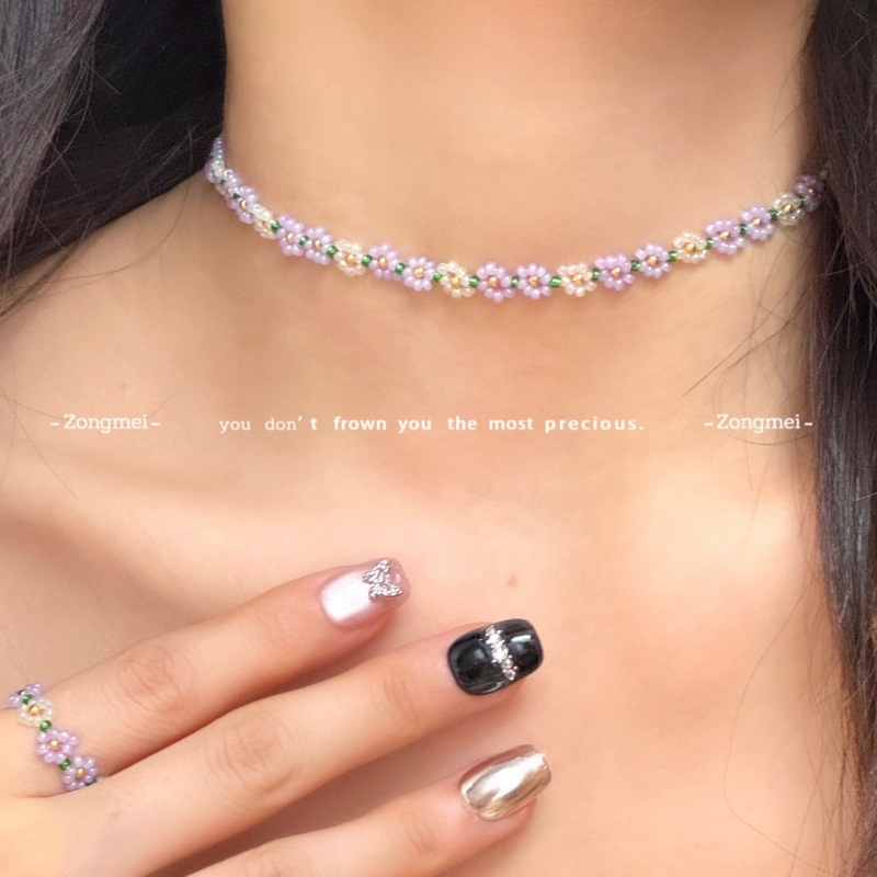 Jewelry suit Pastoral Style Fresh Rice Beads Titanium Steel Flower Necklace Bracelet Ring Mori Trendy Girl's Heart Women