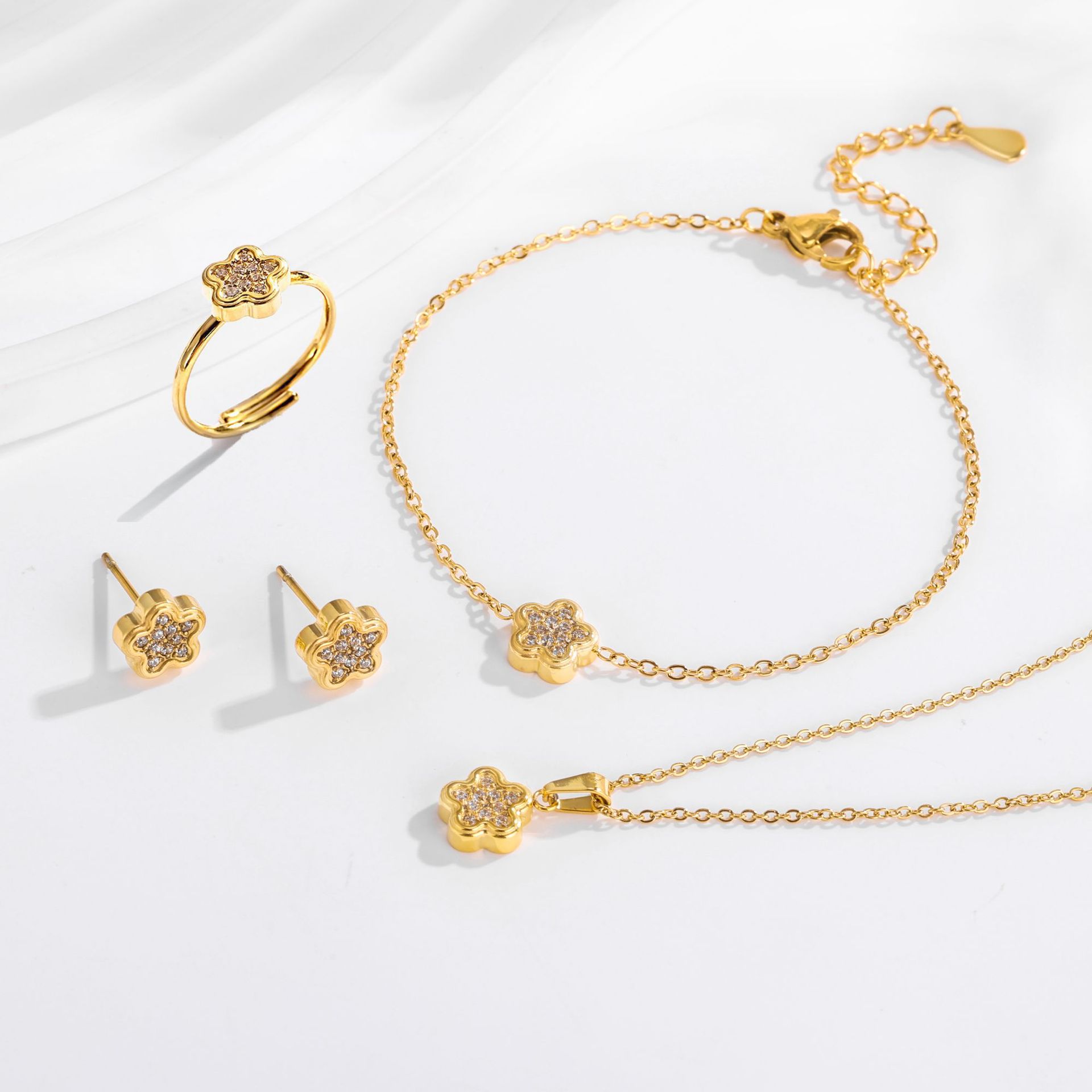 Korean Fashion Trendy Four-Leaf Clover Necklace Bracelet Earrings Ring Four-Piece Set Versatile Lucky Clover Jewelry Gift for Girlfriend