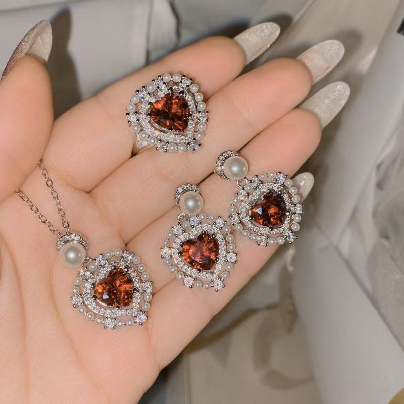 Cross-Border Alloy Seiko Cherry Blossom Pink Sky Blue Pearl Love Necklace Earrings Ring Design Set Ready for Sale