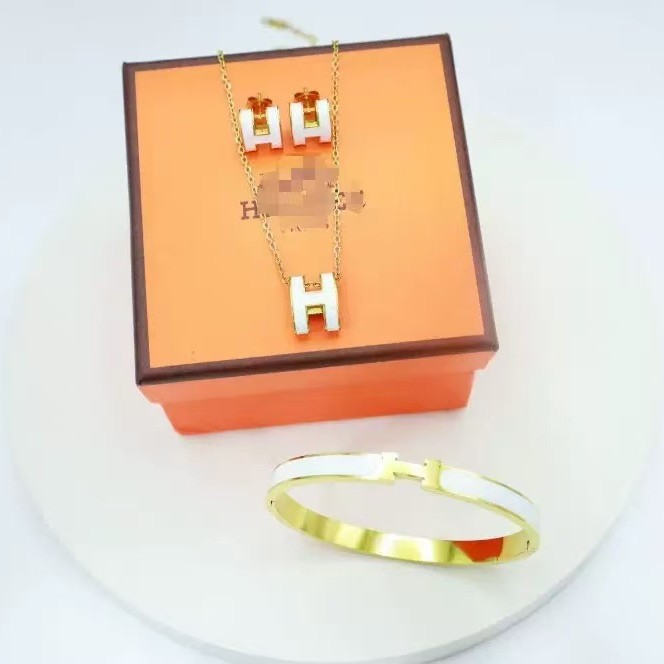 H Letter Necklace Titanium Steel European and American Enamel Pendant Stainless Steel Bracelet Earrings Necklace Set Clavicle Chain Popular