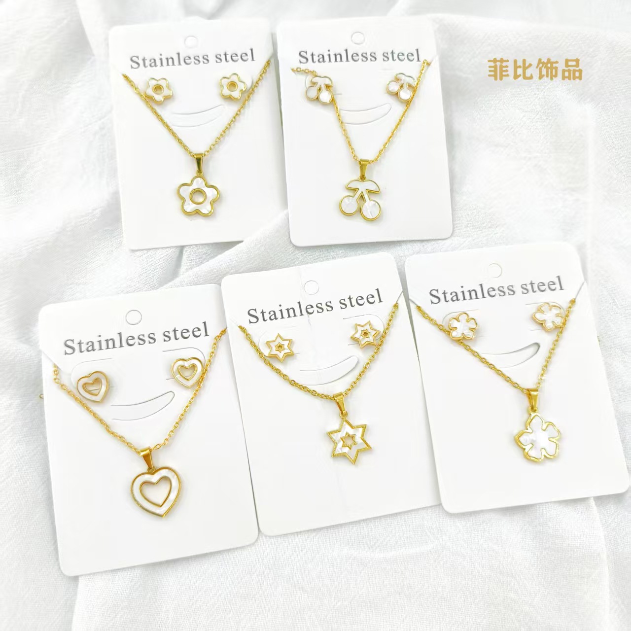 Cross-Border Stainless Steel Mother-Of-Pearl Non-Fading Flower Heart Star Cherry Necklace Earrings Versatile Jewelry Set