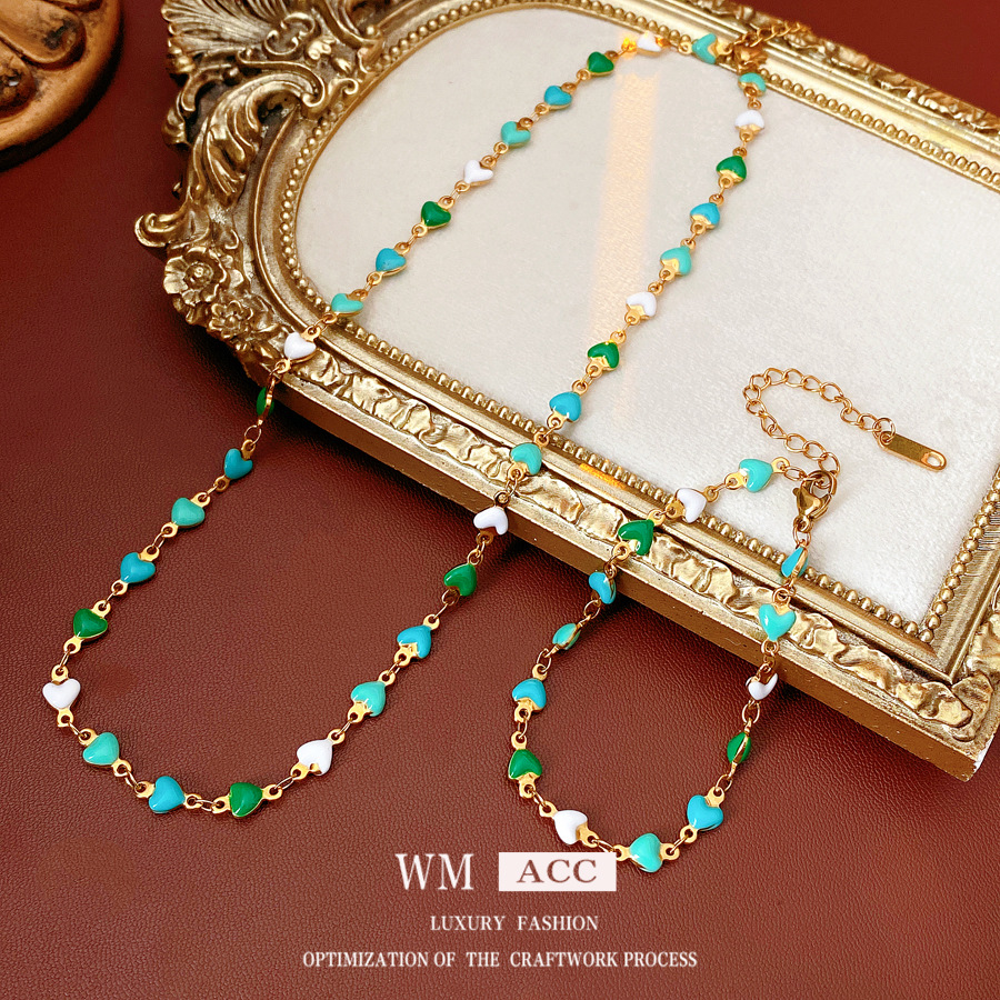 Vintage Enamel Heart Bracelet and Necklace Set, Fashionable Retro High-End Design Niche Jewelry