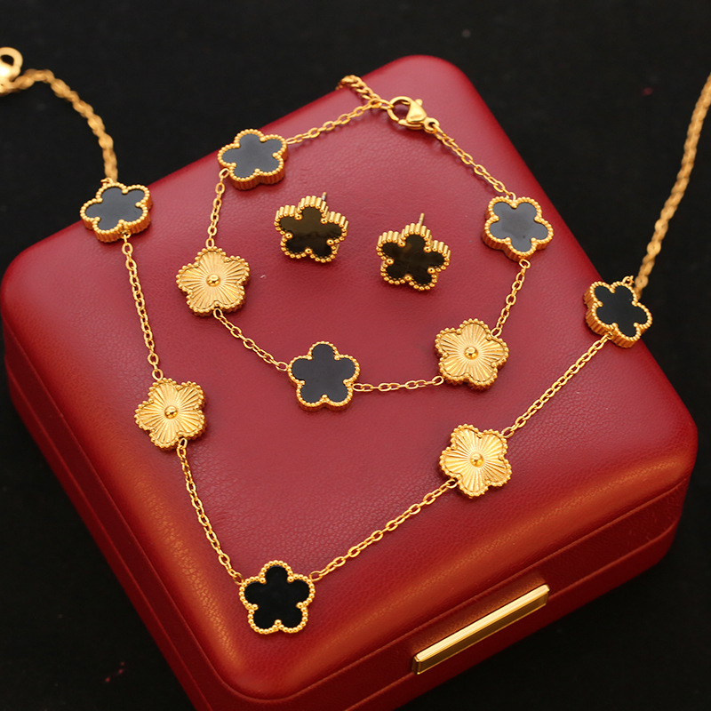 Cross-Border Hot-Selling Handmade Batch Flower 18K Furnace Real Gold Clover Earrings Necklace Bracelet Stainless Steel Set