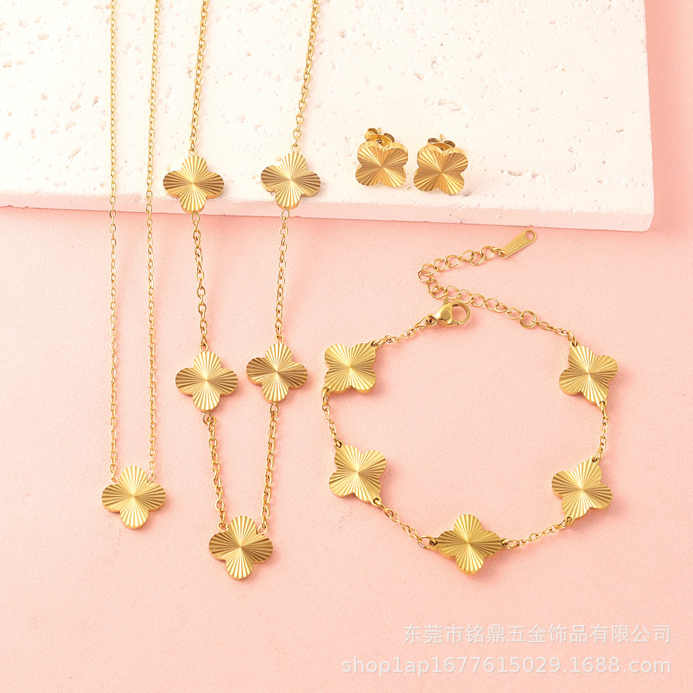 Cross-Border Hot Selling Golden Lucky Clover Double-Sided Petal Necklace Earrings Bracelet Women's Jewelry Set Wholesale