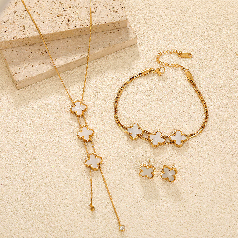 Cross-Border Light Luxury Four-Leaf Clover Necklace Three-Piece Set, Fashionable and Exquisite Stainless Steel Double-Layer Bracelet, Versatile Four-Leaf Clover Set