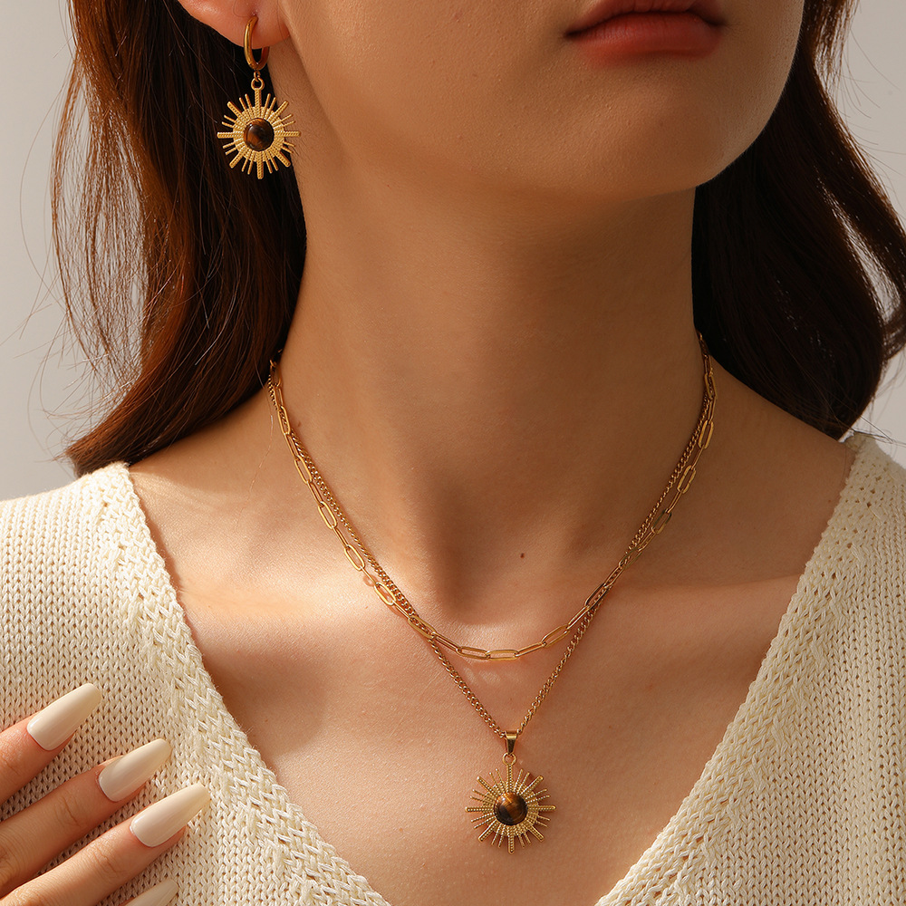 Stainless Steel Sunflower Necklace and Earrings Set European and American Natural Stone Pendant Women's Flower Earrings Titanium Steel Jewelry