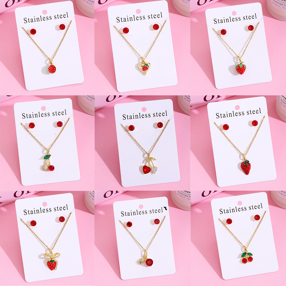 Japanese and Korean Style Strawberry Cherry Micro Necklace Earrings suit Light Luxury Sweet 304 Stainless Steel Design Clavicle Chain for Women