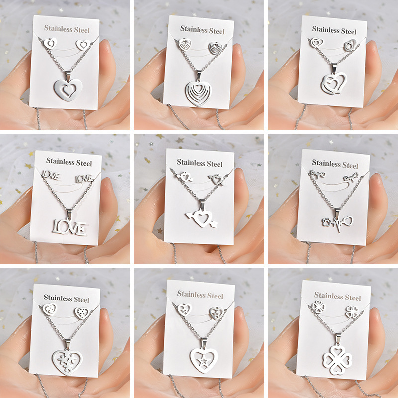 European and American Jewelry suit Heart-shaped Natural Stone Necklace Love Earrings Women's Summer High-end Color-free Titanium Steel Jewelry