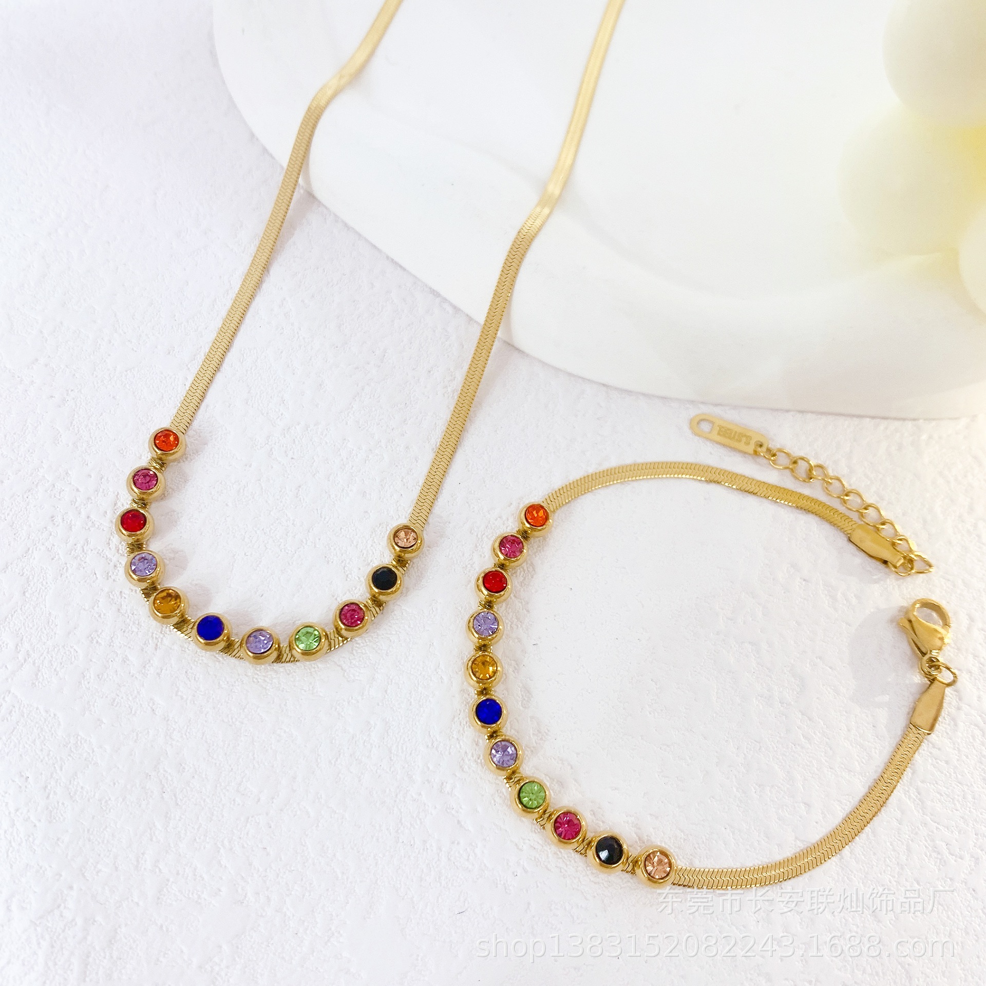 Tiktok Trending Colorful Diamond Titanium Steel Collarbone Chain for Women Ins Style Gold-Plated Snake Bone Chain High-End Necklace and Bracelet Set