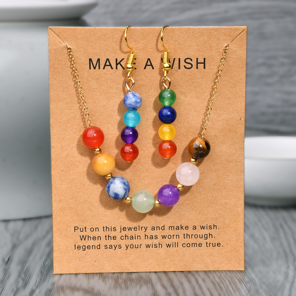 Simple Colorful Natural Stone Beaded Necklace Earrings suit Ins Style Golden Stainless Steel Chain Collar Chain Jewelry