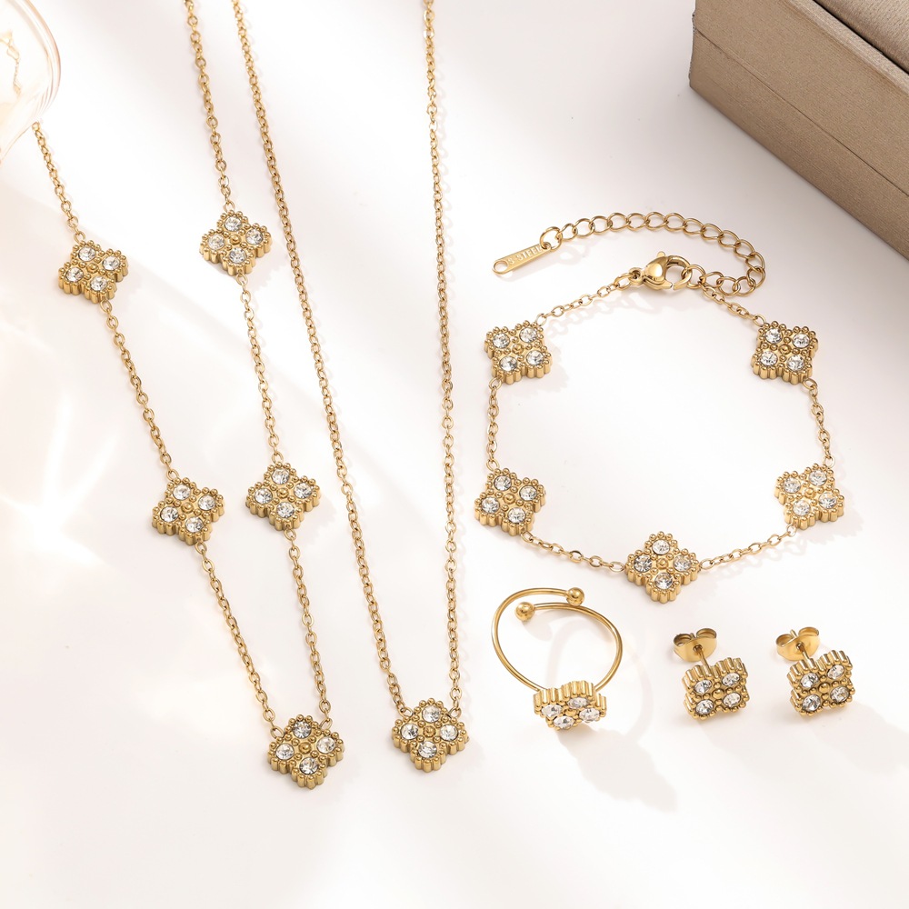 European and American Cross-Border Fashion Retro Diamond-Encrusted Four-Petal Flower Stainless Steel Necklace Earrings Bracelet Ring Jewelry Set