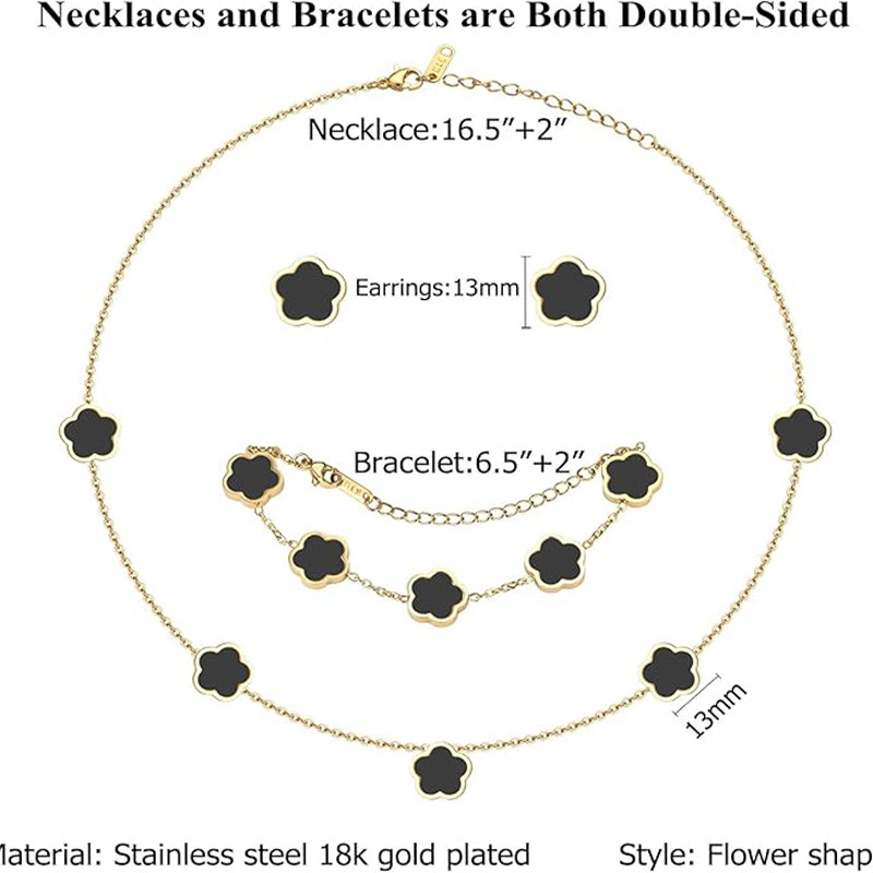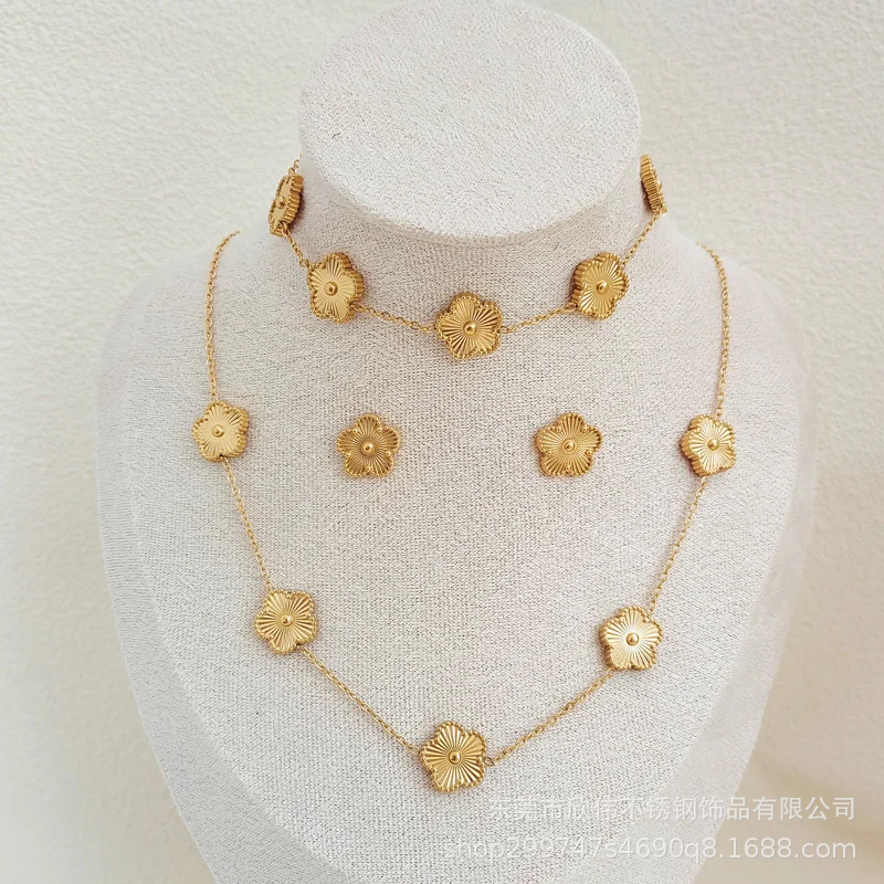 High Quality Stainless Steel Double Sided Flower Ornament Set 18K Gold Silver Plated Five Leaf Flower Necklace Bracelet Earring Lady
