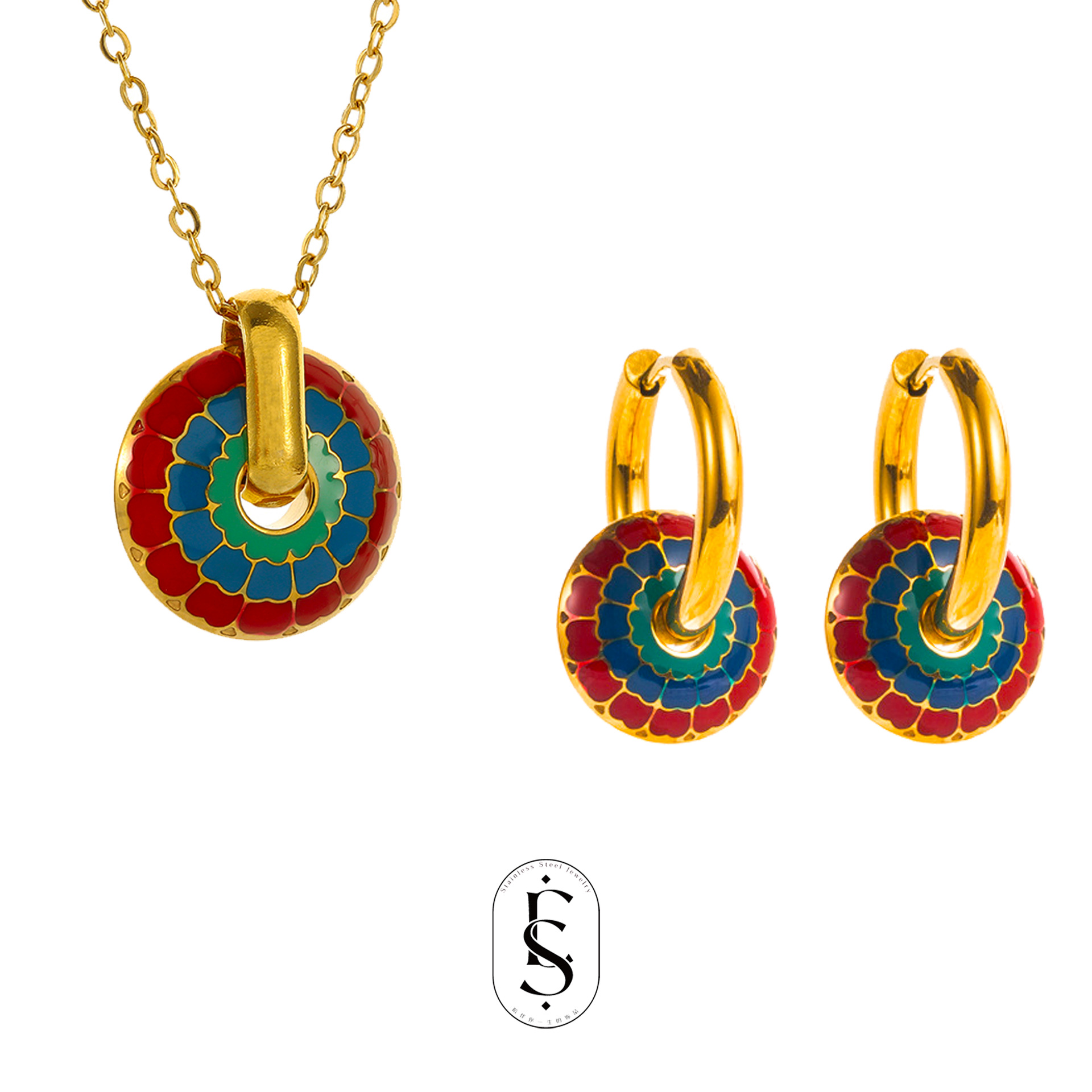 European and American Cross-Border Retro Oil-Dropping Round Fan-Shaped Painted Necklace Earrings Jewelry Set High-End Fashion Trend for Women