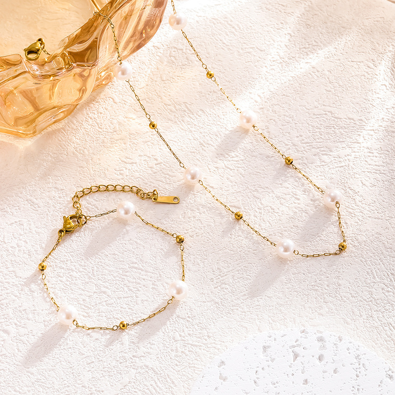 Cross-Border Fashion Retro Versatile Geometric Round Pearl Gold-Plated Chain Accessories Stainless Steel Bracelet Necklace Set