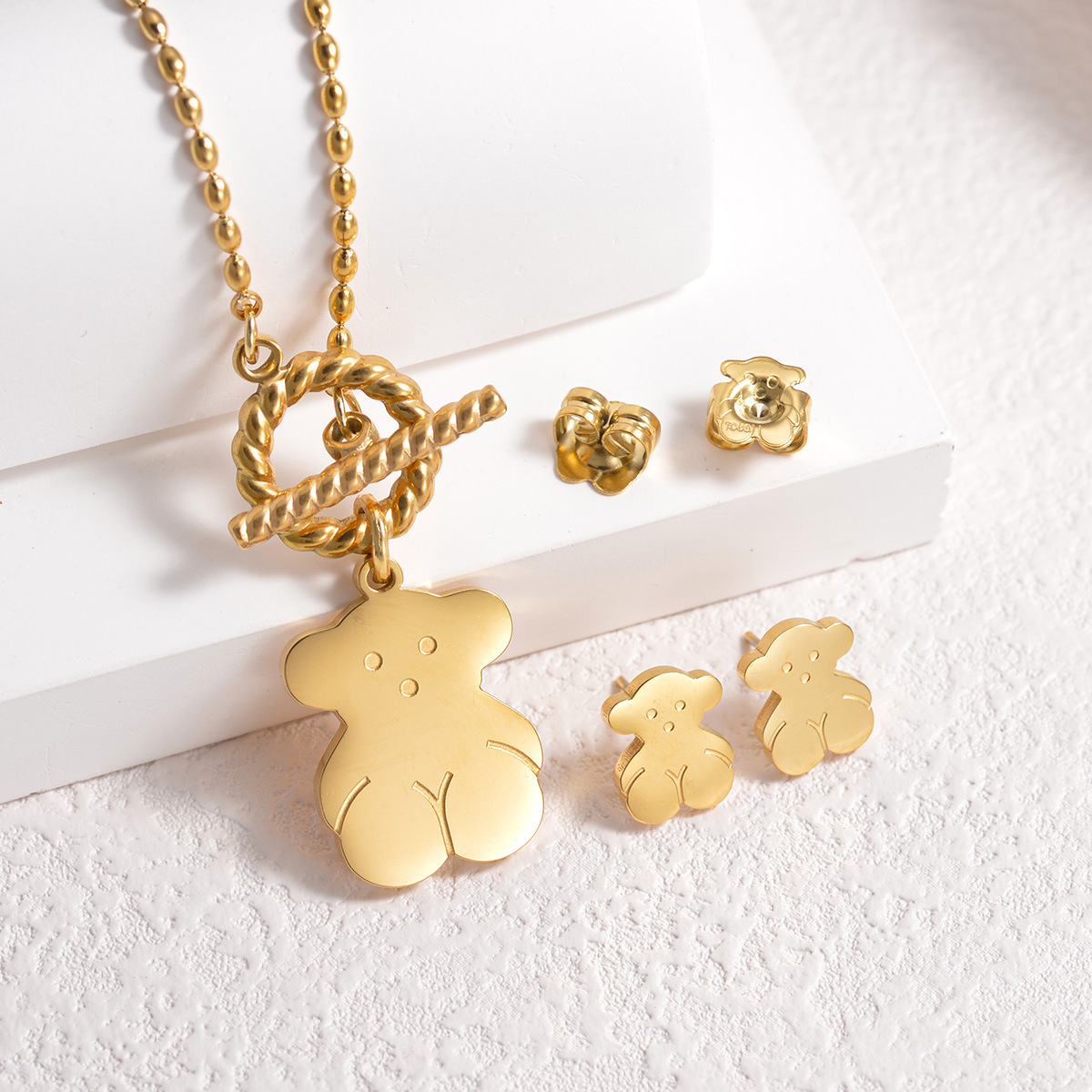 New 2024 Original Stainless Steel Bear Pendant Necklace Earring Set European and American Style Easiest for Match Titanium Steel Women