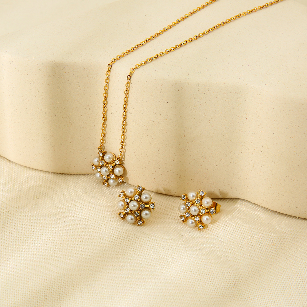 European and American Ins Fashion Simple Versatile Rhinestone Pearl Flower Earrings Necklace Set Stainless Steel Plated 18K Gold Necklace