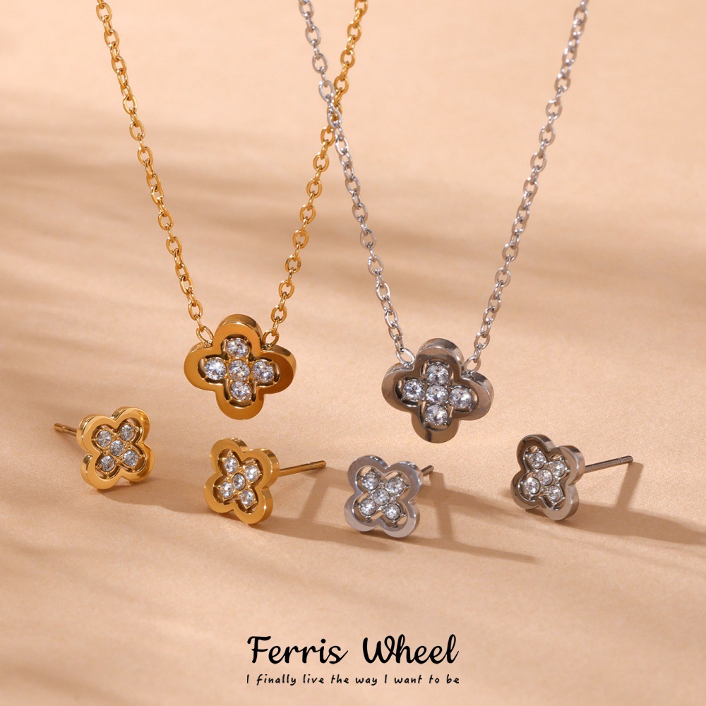 Ferris Wheel Accessible Luxury 5A Zircon Four-Leaf Flower Clavicle Chain Earrings Niche Exquisite Women's Jewelry Set Titanium Steel Color Retention