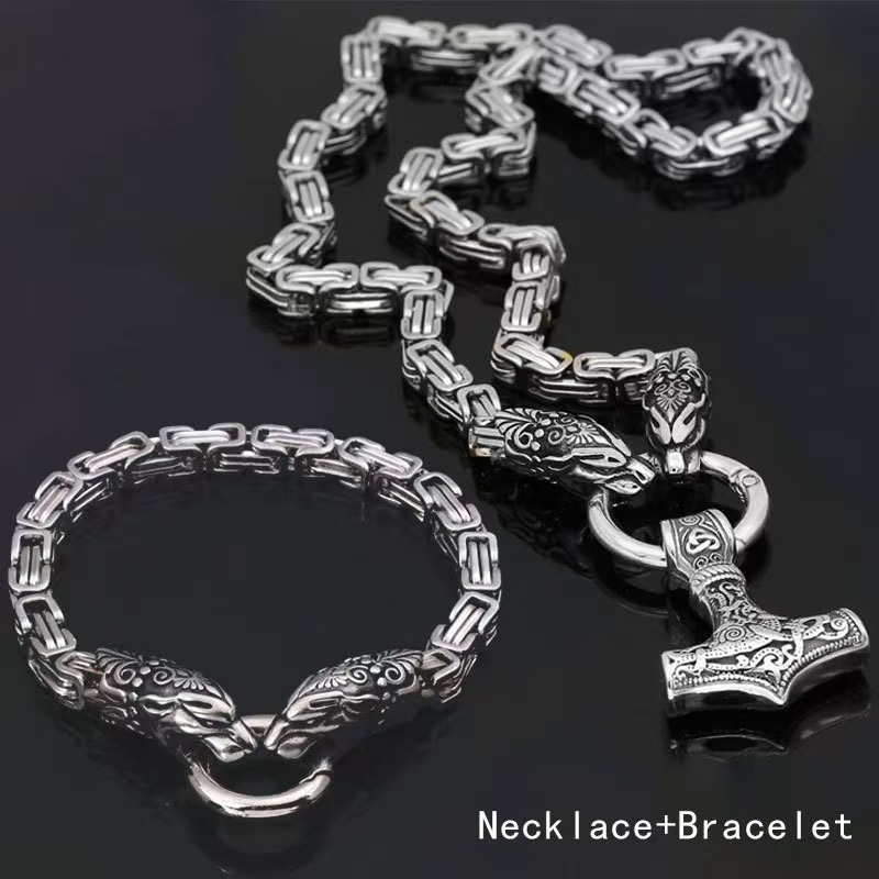 Cross-border Hot Sale Viking Vintage Rune Hammer Pendant Wolf Head Necklace Bracelet Stainless Steel Chain Nordic Jewelry suit