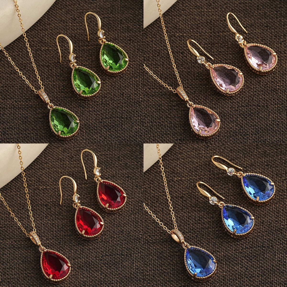 Retro Hong Kong Style Copper Gold-Plated Colorfuled Crystal Glass Drop-Shaped Earrings Stainless Steel Chain Necklace Pendant Set