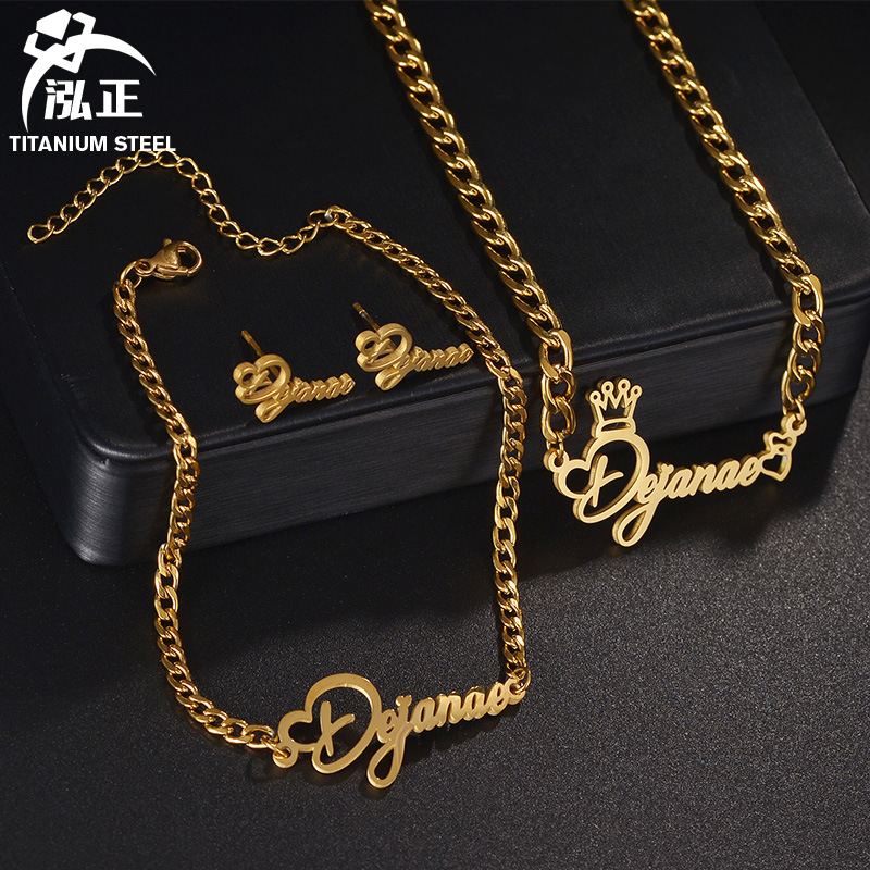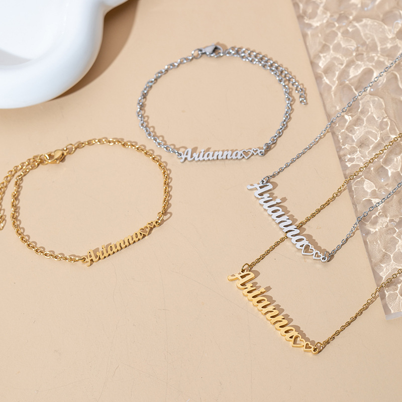 European and American Personalized Fashion Customized English Letter Necklace High-End Cut Stainless Steel Font Bracelet Jewelry Set