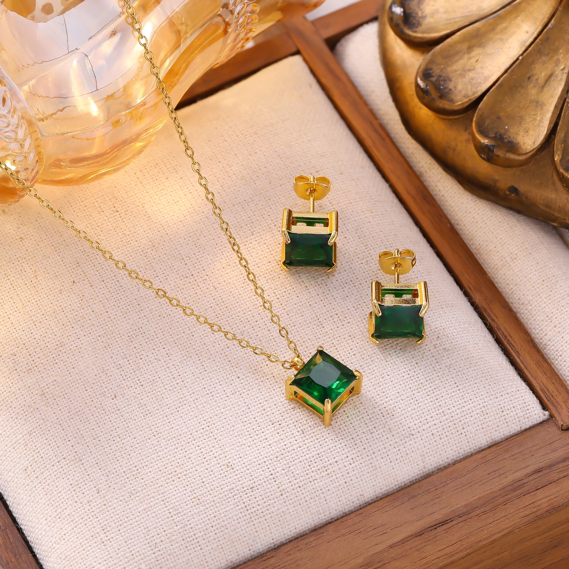 Ins Fashion Simple Stainless Steel Set for Women Green Zircon Niche High-End Earrings Necklace Jewelry Set for Women