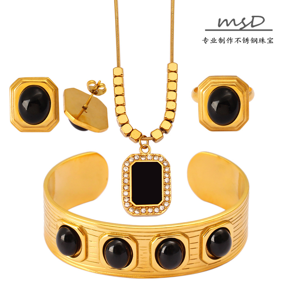 European and American Retro Design Wide Face Set with Natural Stone Opening Bracelet 18K Gold Geometric Square Earrings Ring Set for Women