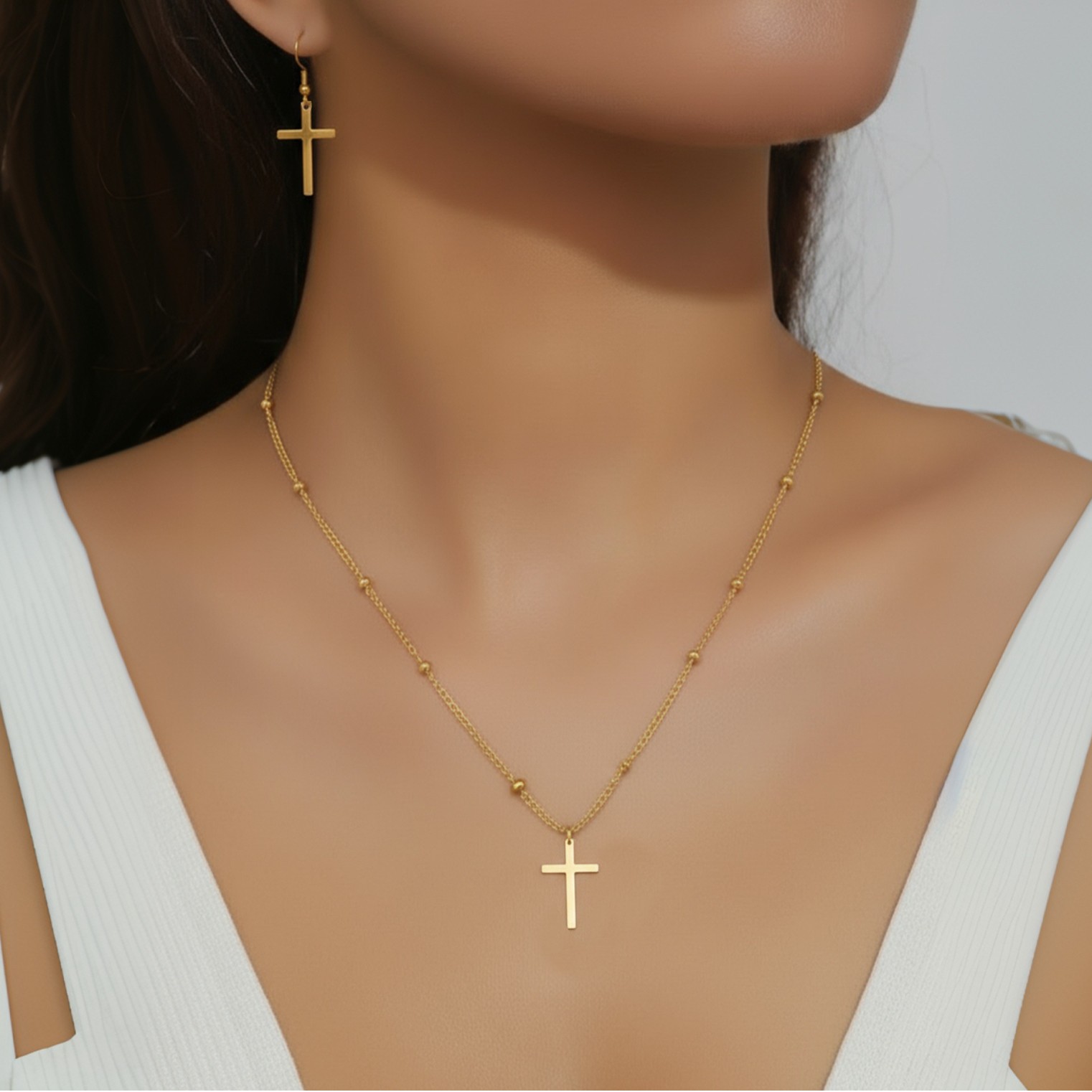 Stainless Steel Simple Design Cross Pendant Small Bead Necklace Earrings Set Women's Fashion Versatile Jewelry
