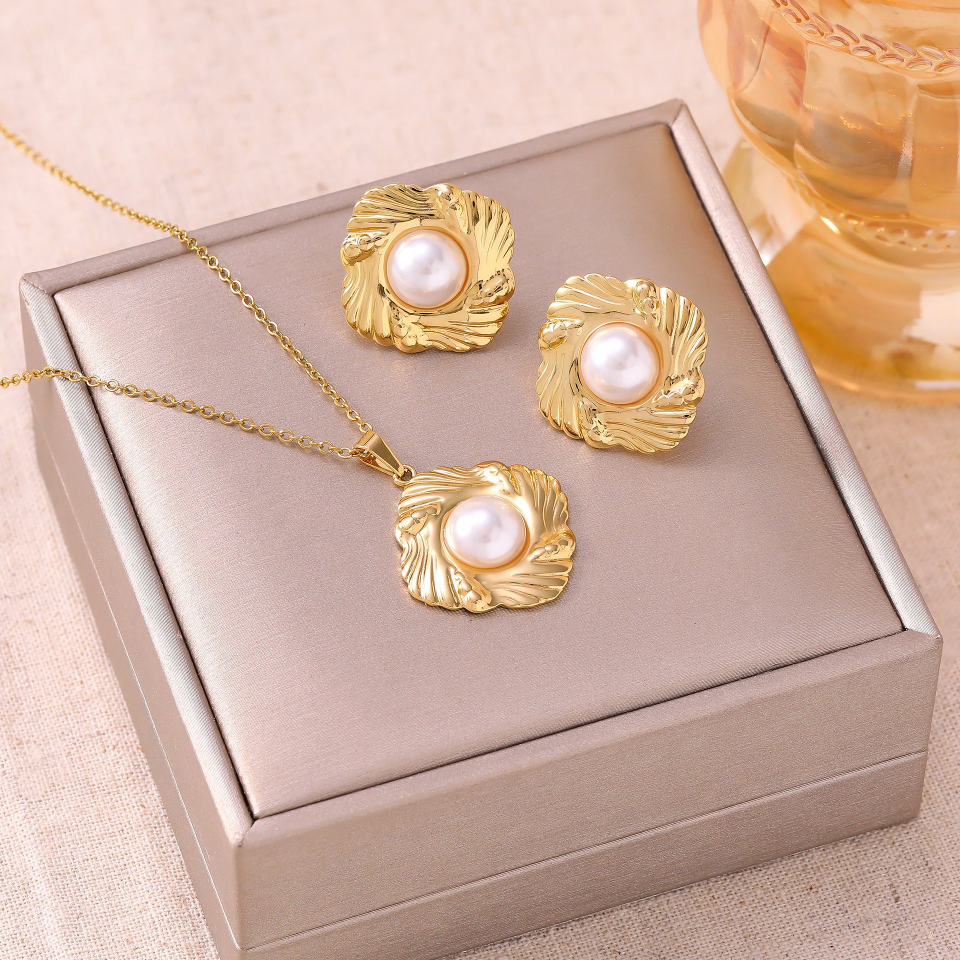 New Simple and Versatile Stainless Steel Jewelry Set for Women, Geometric Pearl Light Luxury Jewelry Combination, Cross-Border Best-Selling Model