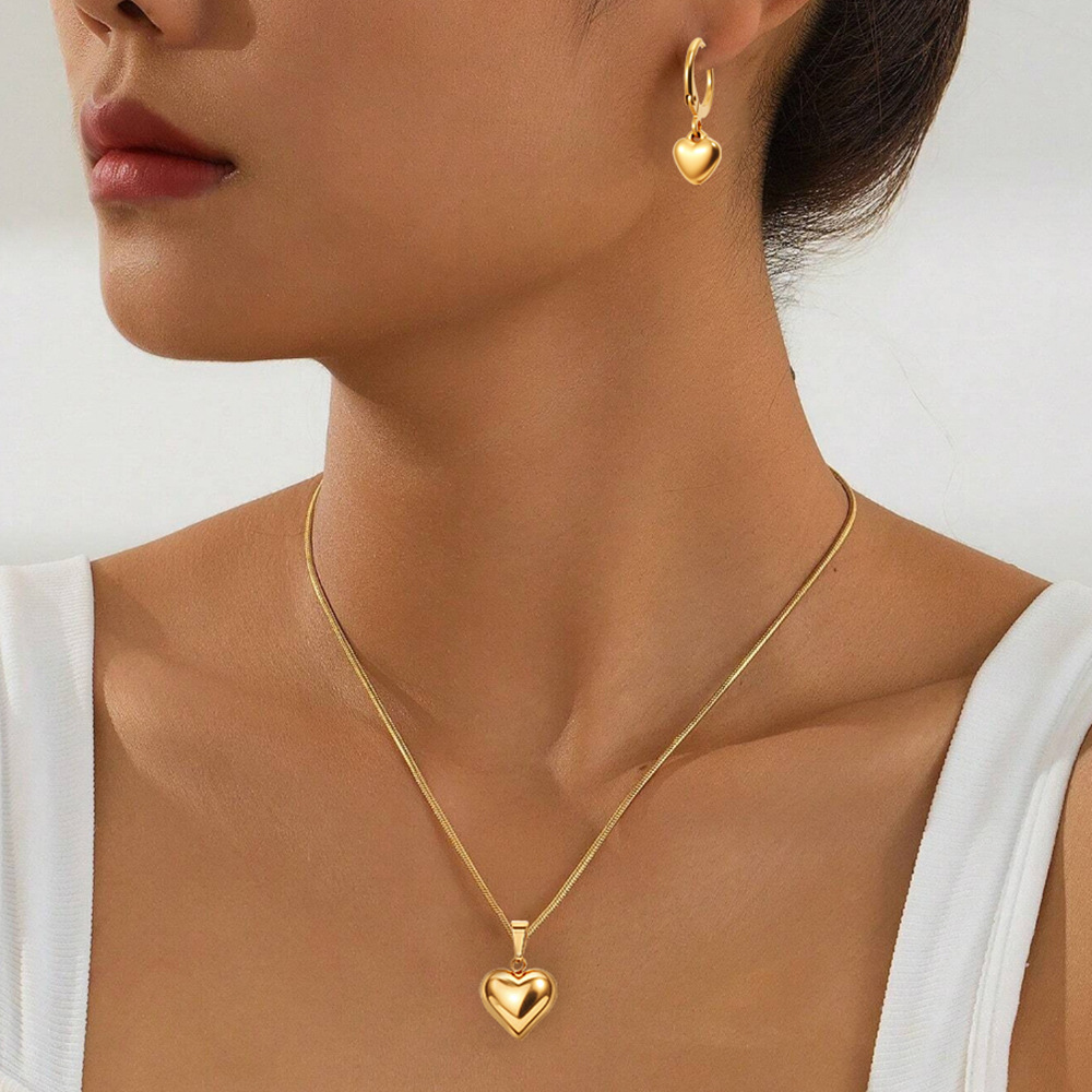 Stainless Steel Japanese and Korean Ins Niche Simple Fashion Versatile Three-Dimensional Heart-Shaped Pendant Necklace Earrings Jewelry Set for Women