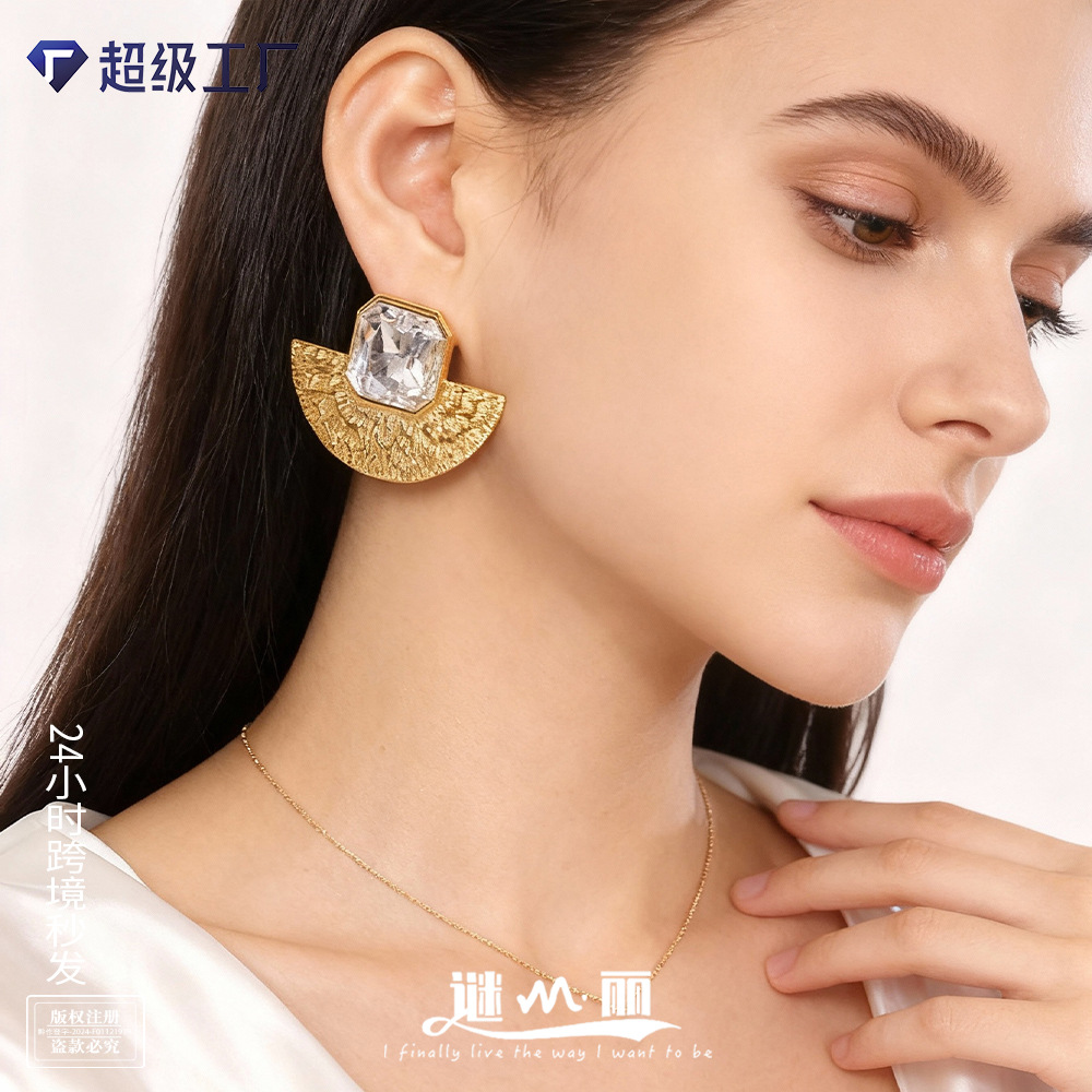 Mili Stainless Steel Fan-Shaped Glass Stone Earrings Clavicle Chain Plated with 18K Real Gold Mid-Century Fashion Jewelry Set