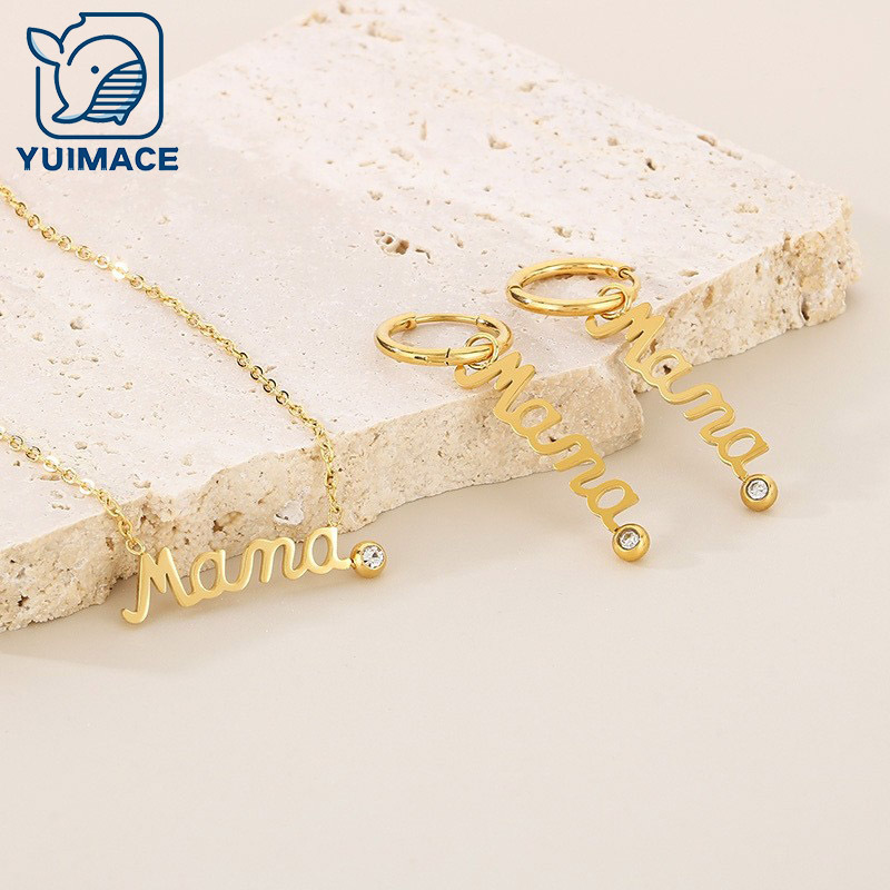 New Mother's Day Temperament Joker Round Diamond English Letter Mama Stainless Steel Earrings Titanium Steel Necklace suit Jewelry