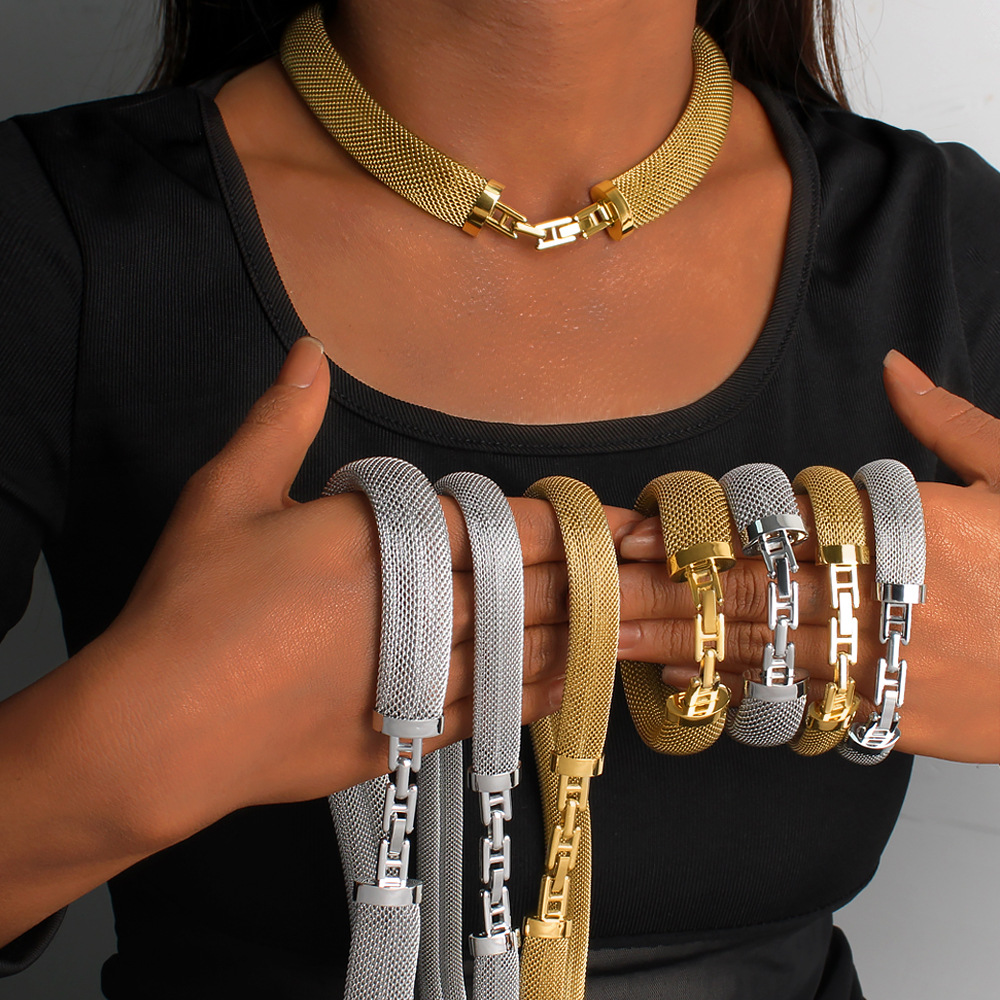 Yue Jewelry European and American Cross-Border Mesh Jewelry Clasp Open Bracelet Necklace Titanium Steel 18K Gold Non-Fading Fashion Set Now Available